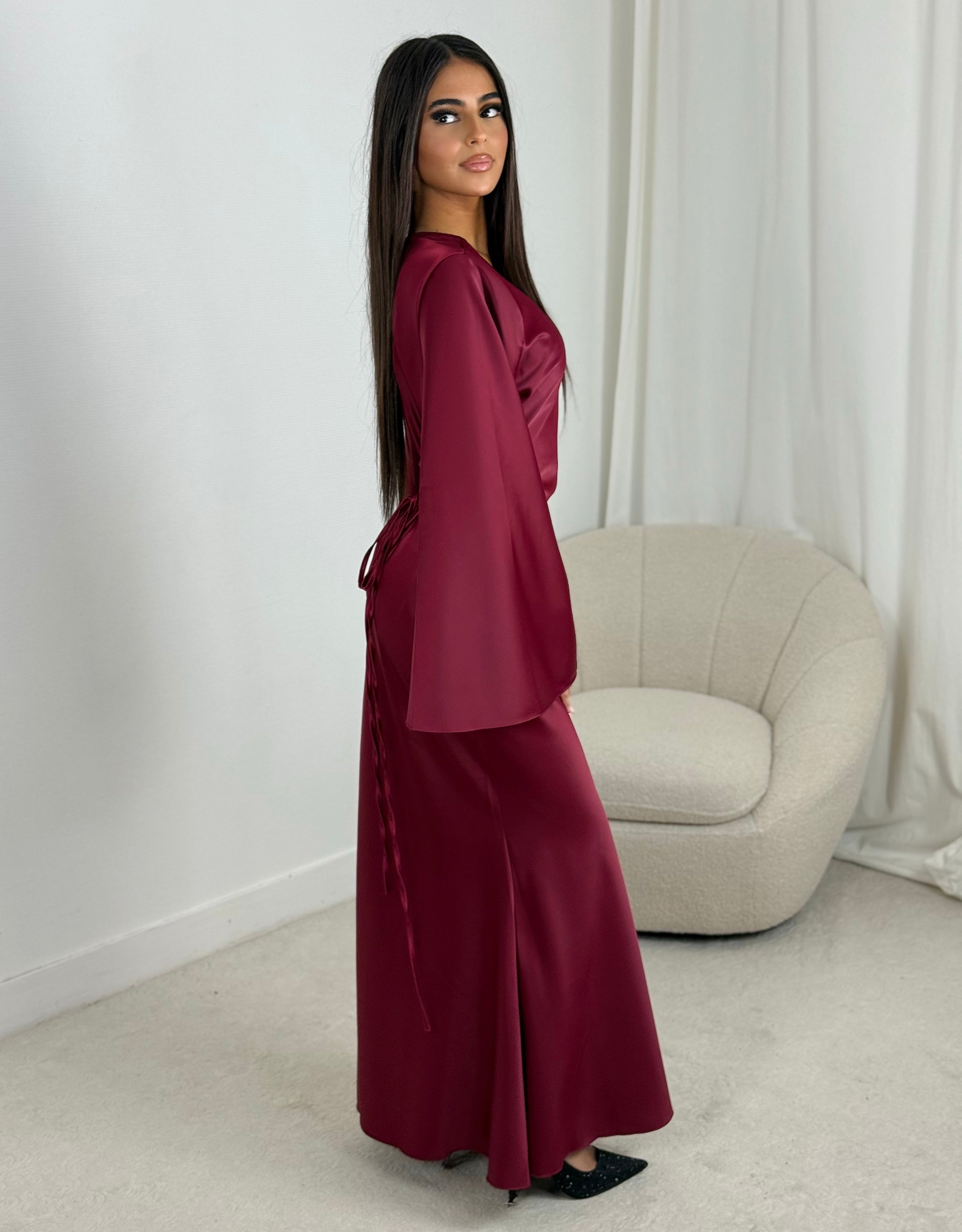 Longue robe satinée élégante à manches larges, cintrée à la taille et resserrée avec des fils à l'arrière.